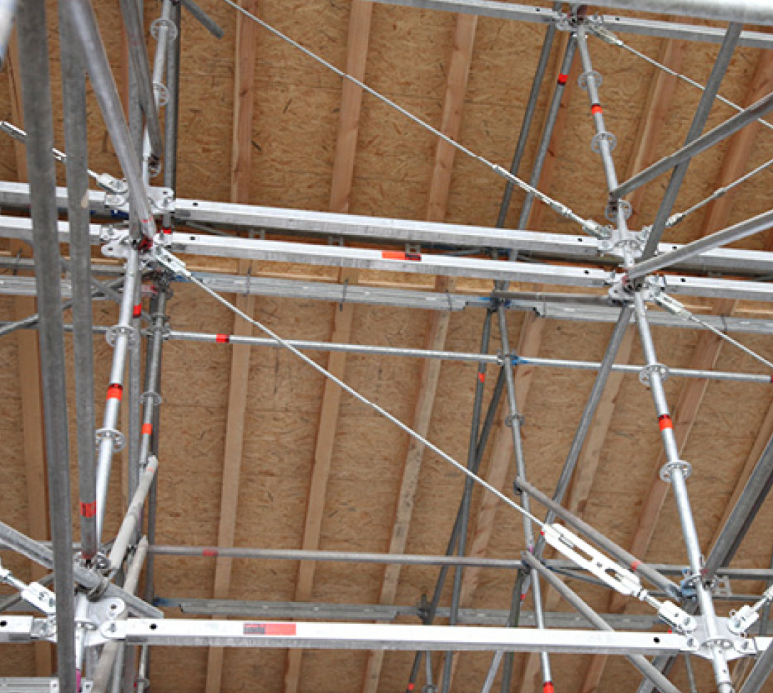 Auf den Gebäudedecken war keine Ablastung möglich. Die 28 t schweren Arbeitsplattformen wurden daher mithilfe des Allround Fachwerkträgers 18 m freispannend zwischen die Hallensäulen platziert und an den Dachbindern abgehängt. Durch die gleichen Systemmaße lässt sich der Allround Fachwerkträger vollständig in AllroundGerüst-Konstruktionen integrieren.