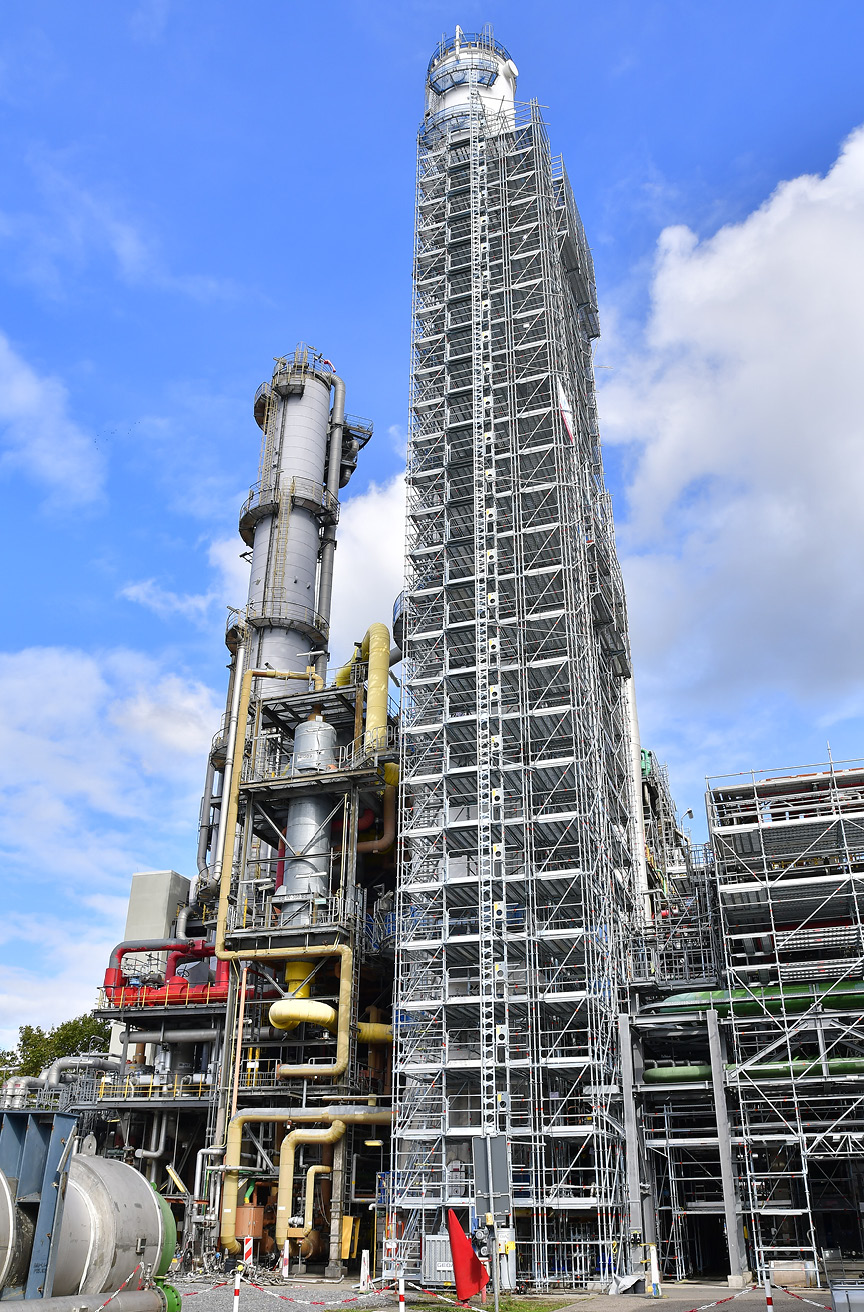Die Themen Effizienz und Sicherheit haben in der Prozessindustrie eine hohe Bedeutung – auch beim Erstellen von Gerüst- und Höhenzugängen. Aktuelles Beispiel: die Einrüstung einer Kolonne für Wartungs- und Instandsetzungsarbeiten. Beim rund 50 m hohen Arbeitsgerüst mussten nicht nur neue Anlagenbauteile wie Pumpen, Saug- und Druckleitungen, die zugehörigen Stahlbauarbeiten sowie die Isolierarbeiten an den Rohrleitungen in der Planung berücksichtigt werden. Ziel war auch, die kostenintensiven Stillstandszeiten zu reduzieren – ohne auf Sicherheit zu verzichten. Die Vorplanung in 3D, der Einsatz des AllroundGerüsts sowie Montage und Demontage durch das spezialisierte Gerüstbauunternehmen Nureldin waren hierbei die entscheidenden Erfolgsfaktoren.