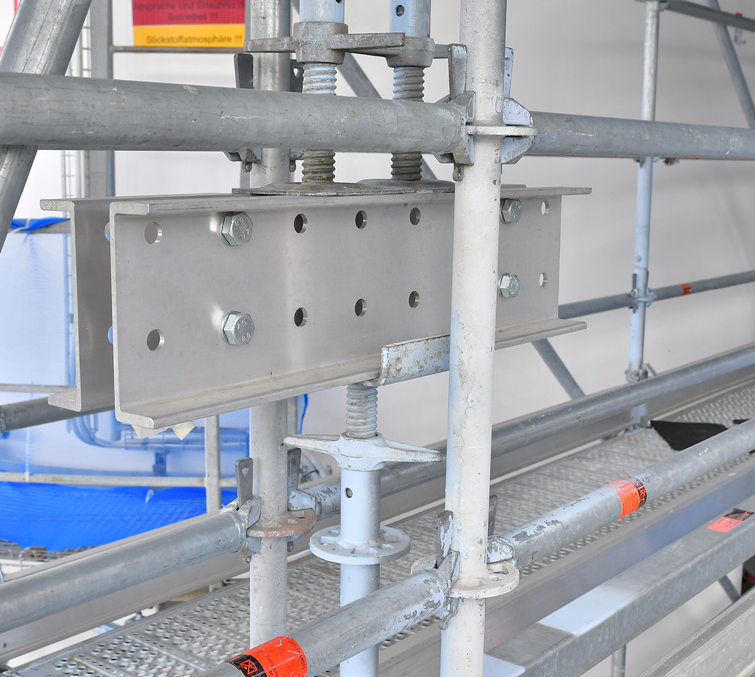 Der Umbau der Vorsprünge über die gesamte Höhe des Gerüsts war aufgrund angrenzender Anlagenteile weder möglich, noch in wirtschaftlicher Hinsicht sinnvoll. Hier kam daher der hochtragfähige Allround Brückenträger für die Auskragung zum Einsatz.