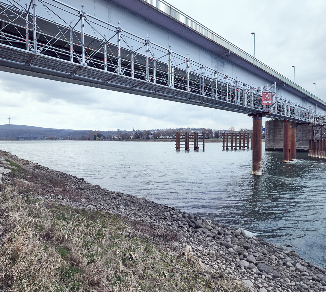 - Temporärer Gerüststeg aus den hochtragfähigen Trägerlösungen Allround Brückenträger und Allround Fachwerkträger. Dank freitragender Spannweiten zwischen 15 und 30 m waren nur zwei Mittelstützen im Rheinbett notwendig