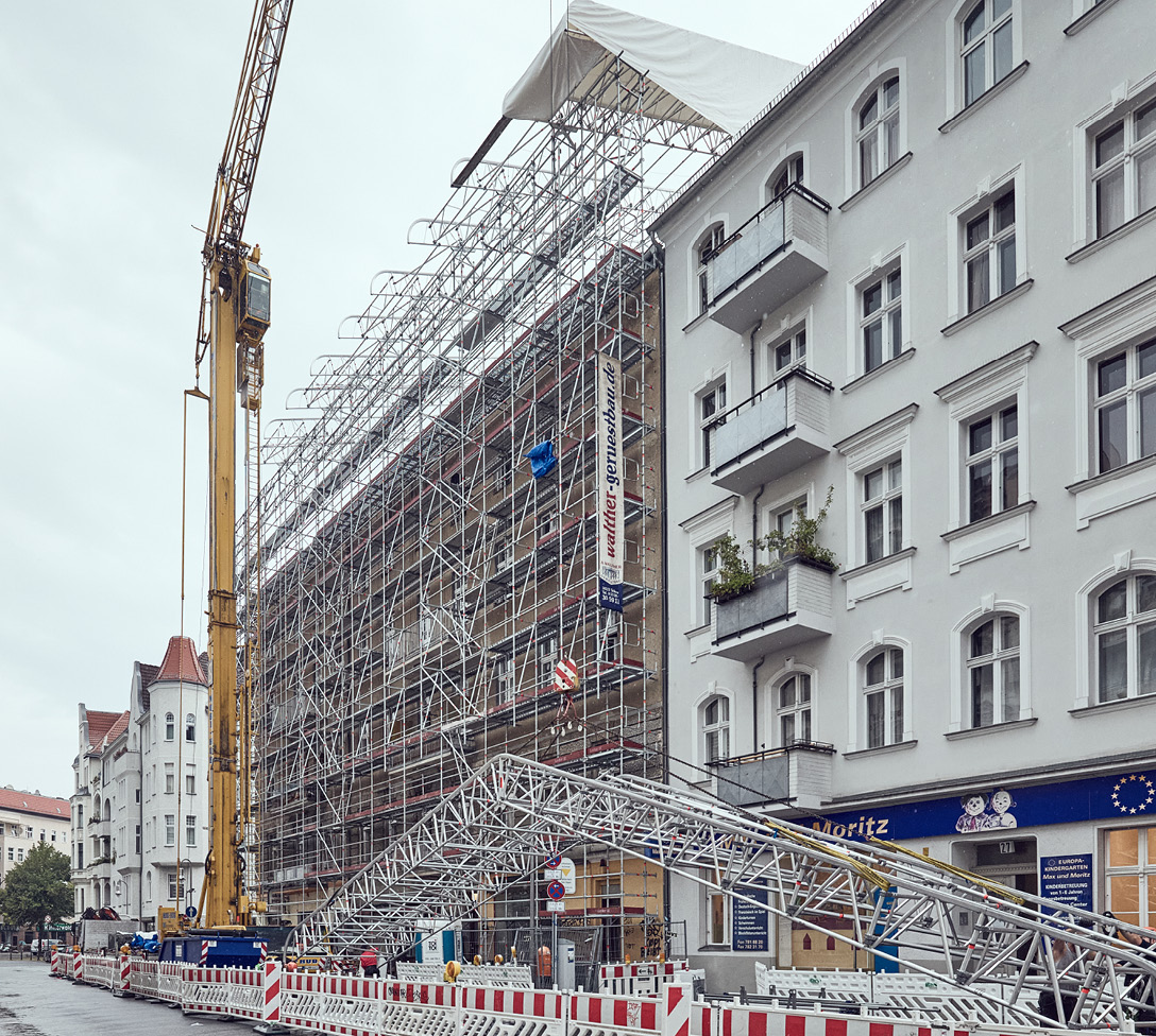 In Berlin stand ein Wohnhaus in Flammen und muss nun saniert werden. Um den Dachstuhl während dieser Zeit vor Witterungseinflüssen zu schützen, montierten die Gerüstprofis von A. Walther Gerüstbau aus Teltow ein Kederdach XL mit rund 20 m Spannweite. Dieses lässt sich dank verschiedener Aussteifungsvarianten auch bei hohen Schneelasten einsetzen und ist wirtschaftlich in der Montage. Dafür sorgen die leichten Bauteile aus Aluminium, die integrierten Kederprofile und die Verbindungtechnik per Einrastklaue. Beim Arbeits- und Stützgerüst gewährleistete das AGS einen schnellen und zugleich sicheren Auf- und Abbau. Die Überbrückung eines angrenzenden Gebäudes war ebenfalls problemlos möglich: mit dem Aluminium-Träger TwixBeam. Eine Lösung mit System.