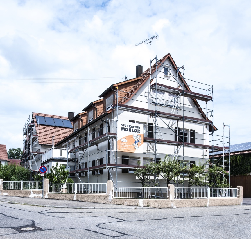 Seine erfahrenen Mitarbeiter bauen vor Ort das Gerüst auf und können durch das einfache Prinzip des führenden Steckrahmengerüsts und die für das Layher BlitzGerüst verfügbaren Ausbauteile problemlos auf die Gegebenheiten vor Ort reagieren. Leichte, einteilige Böden, auch aus Aluminium, erleichtern dabei sowohl den Transport wie den Aufbau. Mit nur sechs Grundelementen und wenigen Handgriffen ist dieses Gerüst in logisch-sicherer Aufbaufolge schnell und schraubenlos montiert. Beim aktuellen Projekt eines Mehrfamilienhauses wurden die knapp 650 m2 Fassadengerüst von 3 Mitarbeitern in gut 2 Tagen gestellt. Es kamen auch Durchstiege mit intergierten Leitern für den sicheren Aufstieg sowie überlange Böden zum Einsatz, um eine Garageneinfahrt auch während der Sanierungsarbeiten befahren zu können. Weitere Konsolen helfen den großen Dachvorsprung passend einzurüsten.