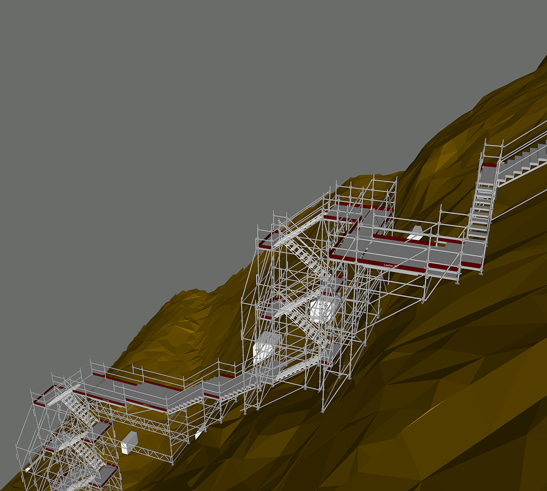 - Detailed 3D preliminary planning using LayPLAN CAD – this made it possible to tailor the temporary scaffolding stairway precisely to the on-site demands while simultaneously keeping material requirements low