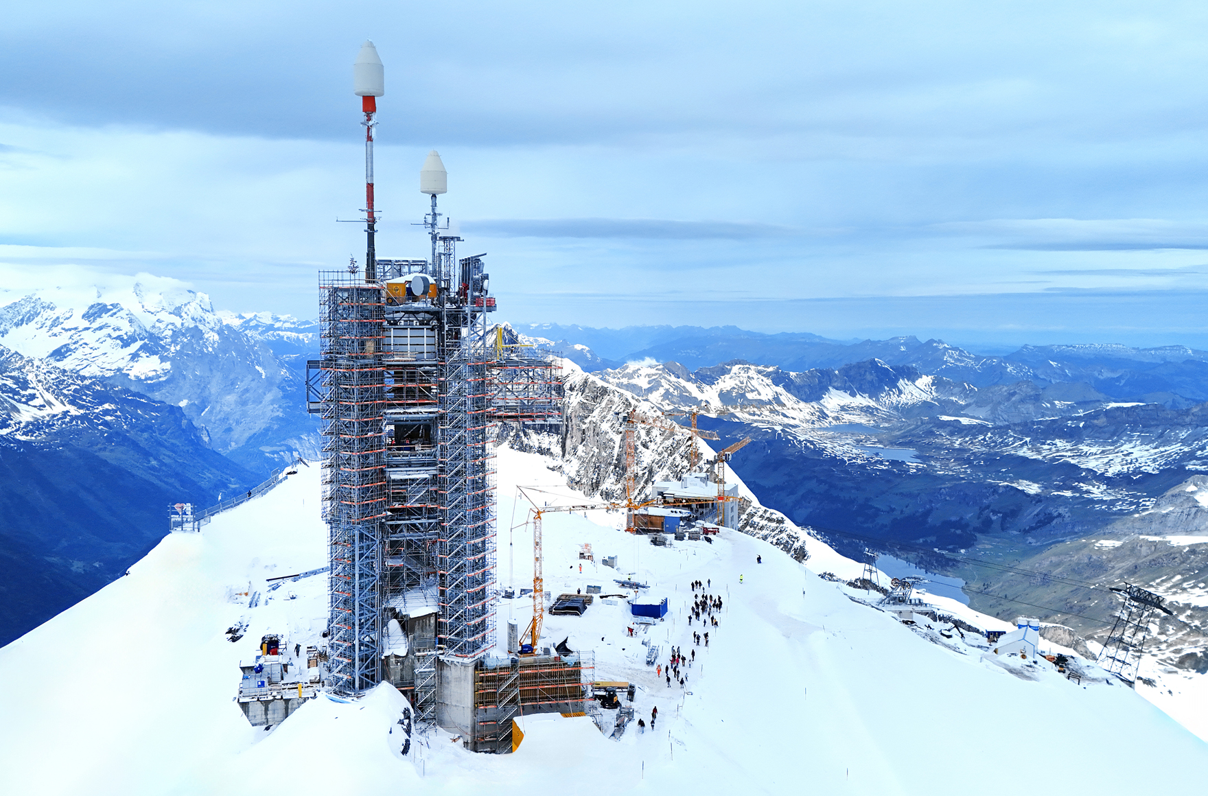 High up in the Swiss Alps, a mountain station is being re-imagined – for example, by transforming a transmission tower into a modern steel-and-glass construction. In the future, the new Titlis Tower will not only welcome visitors with its gastronomy, but will also offer them panoramic views of the surrounding mountainscape. All this has been made possible by a range of facade, surface and suspended scaffolding, as well as shoring structures. Thanks to the versatility of Allround Scaffolding and matching extension parts, such as the high-strength Aluminium FlexBeam, all these structures – including cantilever structures of up to 15 m in length – were assembled without difficulty using a single system. The lightweight, compact, yet nevertheless strong components guaranteed efficient logistics and rapid assembly of scaffolding material weighing up to 300 tonnes. A system-oriented solution.